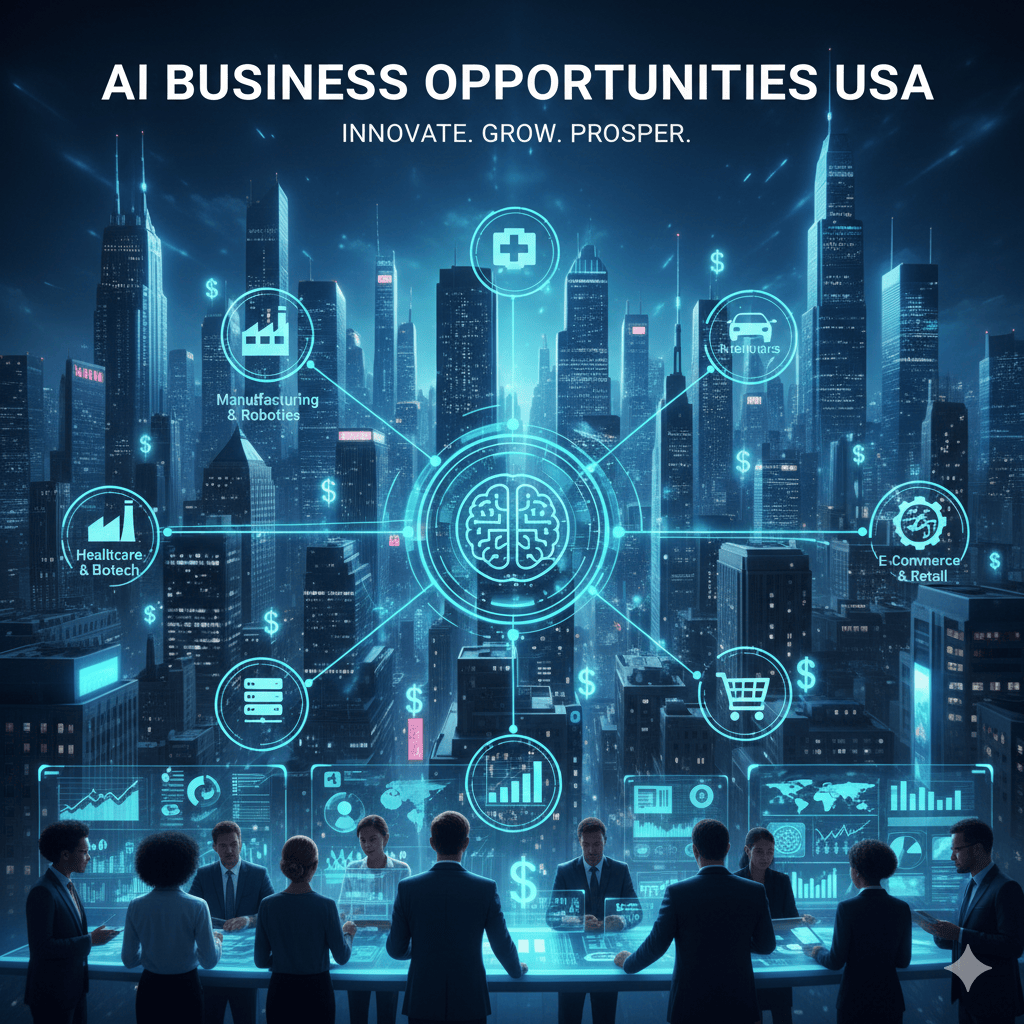 AI business opportunities USA refer to ventures and startups in the United States that use artificial intelligence to solve problems, improve efficiency, or create new products and services across industries such as healthcare, finance, retail, transportation, and marketing.
